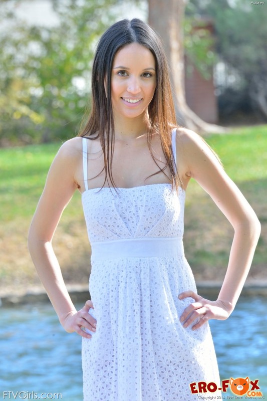 Прогуливаясь на улице, молодая худышка в белом платье, под которым не было нижнего белья, вдруг захотела полностью оголится и продемонстрировать сексуальное тело. Сделав это, очаровательная улыбчивая крошка засветила маленькие сиськи с плоским животиком и конечно же письку с волосатым лобком, в процессе чередуя разные позиции.