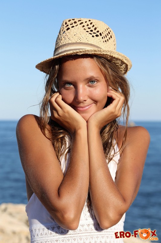 Устроившись на камнях у моря, стройная красавица с загорелым телом начинает медленно раздеваться, снимая белый сарафан, параллельно мило улыбаясь. В процессе молоденькая девушка поворачивалась сочной попочкой, а так же не забывала засвечивать упругие сиськи, средних размеров, с полностью бритой промежность и возбуждающей писькой.