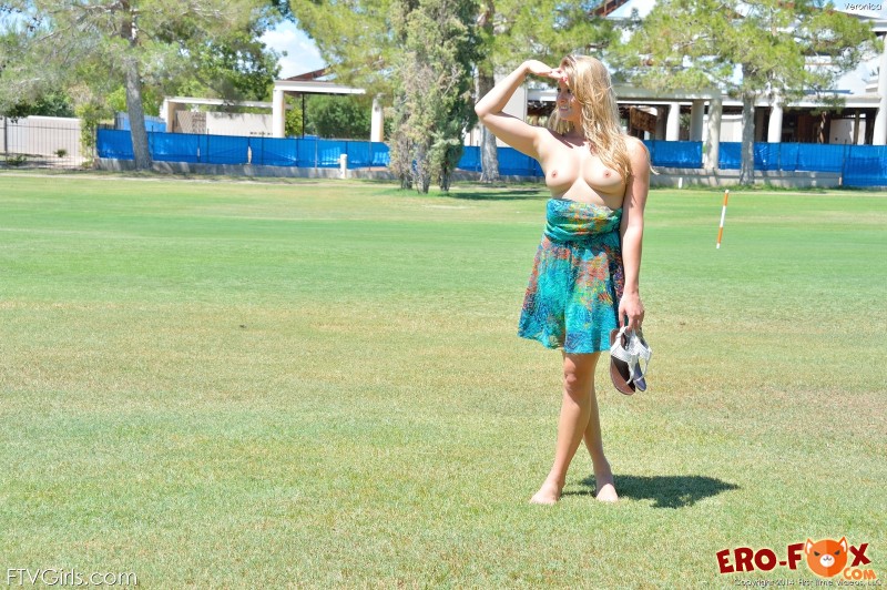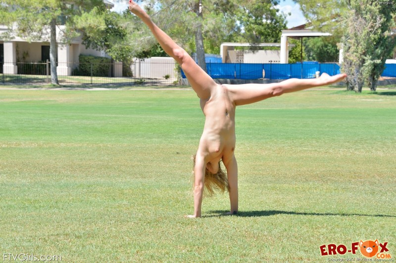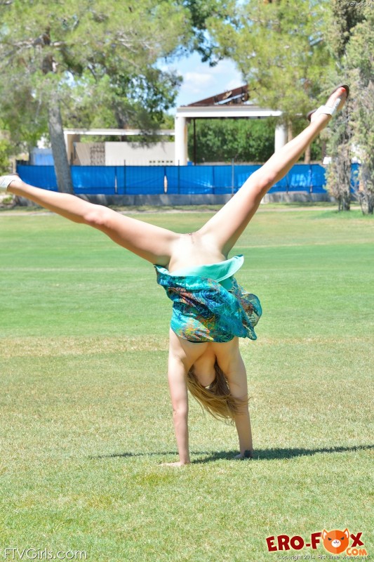 Молоденькая девушка с белоснежной улыбкой, гуляя на улице в платье без нижнего белья, уже через несколько минут начинает медленно раздеваться и позировать. В дальнейшем крошка останавливается на газоне и чередуя самые разные позиции, в том числе становясь на руки и раздвигая промежность демонстрирует упругие натуральные сиськи с бритой киской.