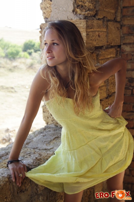 Выбрав заброшенное здание в качестве декорации к своему фото сету, очаровательная девушка в красивом платье и без трусиков под ним медленно обнажается перед камерой, открывая нашему взору свои прелести. Вскоре красавица оказалась совершенно голой и демонстрируя сексуальное тело она чередовала самые разные позы, в некоторых случаях максимально подробно акцентирует внимание на маленькой груди и попке с бритым лобком.