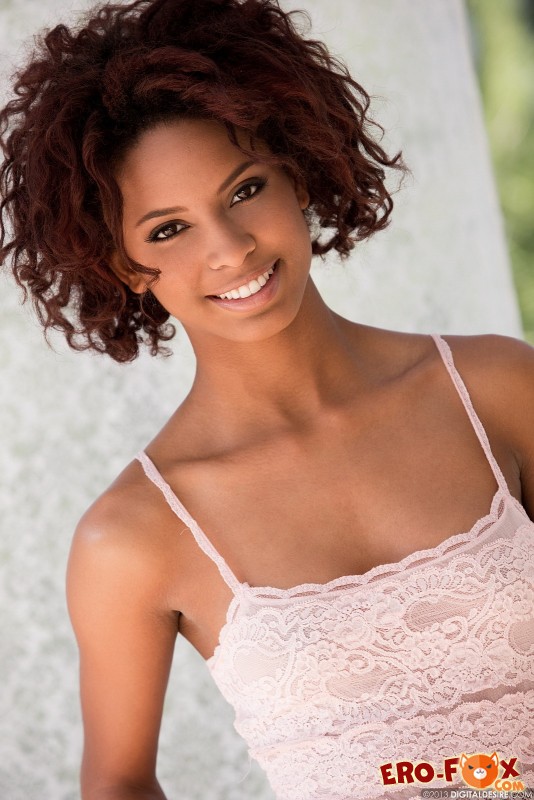 Широко и искренне улыбаясь, молодая негритянка с ослепительно белыми зубами, эротично позируя перед камерой, уже спустя несколько минут принялась медленно раздеваться, снимая юбку и трусики. А в тот великолепный момент когда сексуальная крошка была полностью голенькой, она присела на диван и подробно показала упругую грудь и бритую письку, немного раздвигая ножки.