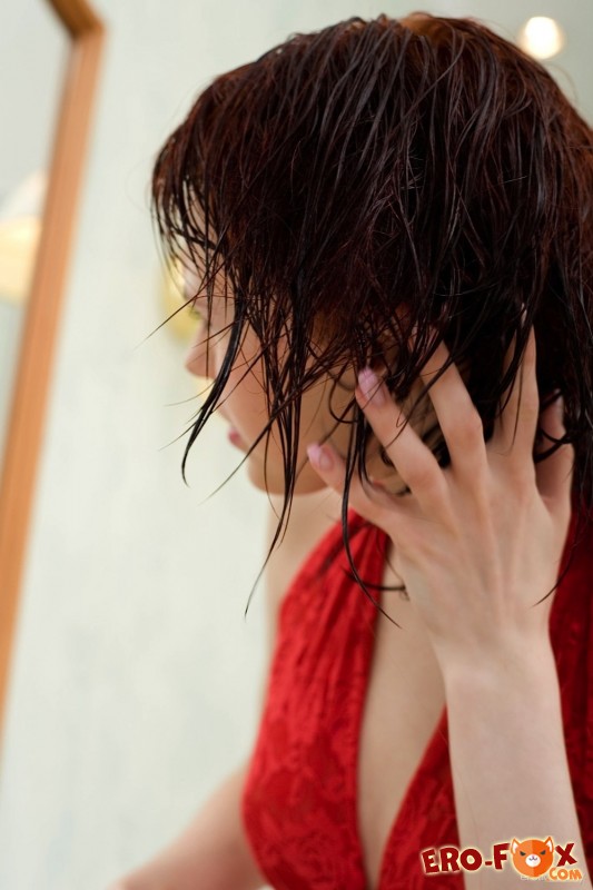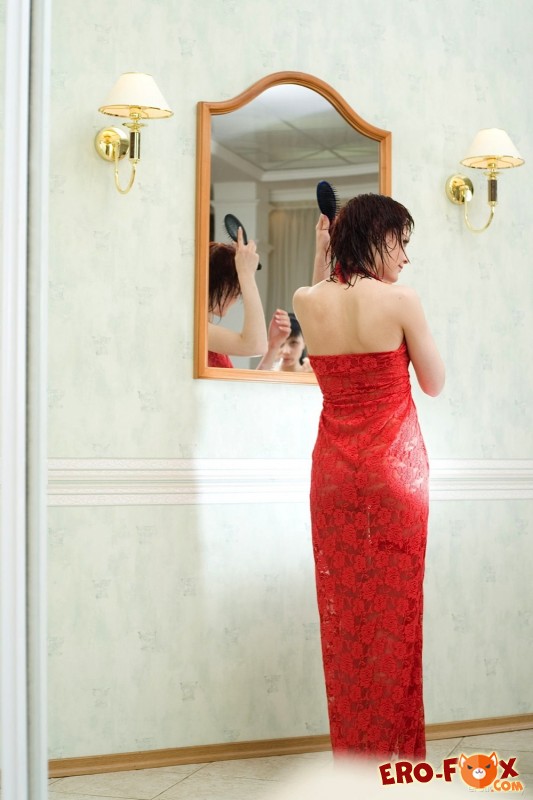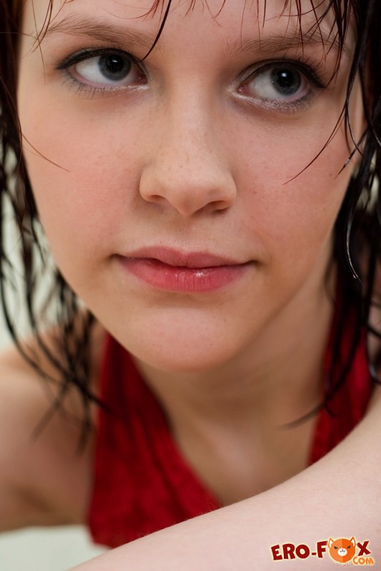 Выйдя с душа, привлекательная девушка со стройной фигурой и мокрыми волосами, накинув красную кружевную ткань начинает эротично позировать на кожаном диване, грациозно закидывая вверх ножки и нежно лаская себя руками, особое внимание уделяя бритой пухлой письке. В процессе съёмки молодая модель так же показывает попку и маленькие сиськи.