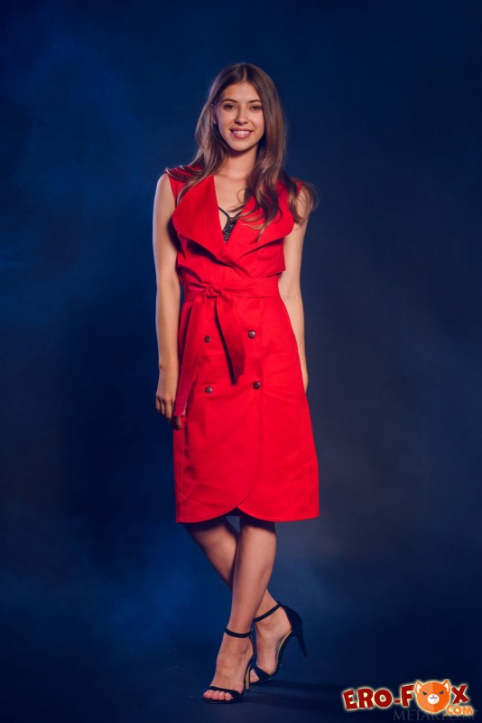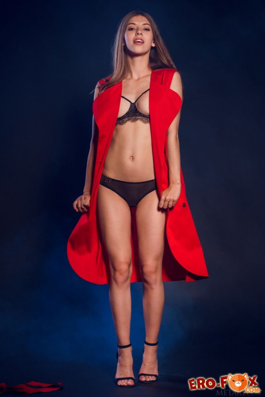 Невероятно сексуальная молодая модель с красивой внешность, нарядившись в эротичное нижнее бельё с прорезью в лифчике для маленьких сисек и накинув красный плащ, начала возбуждающе позировать. В будущем стройняшка все же медленно оголяется и подробно демонстрирует сочную подкаченную попку с бритой писькой.