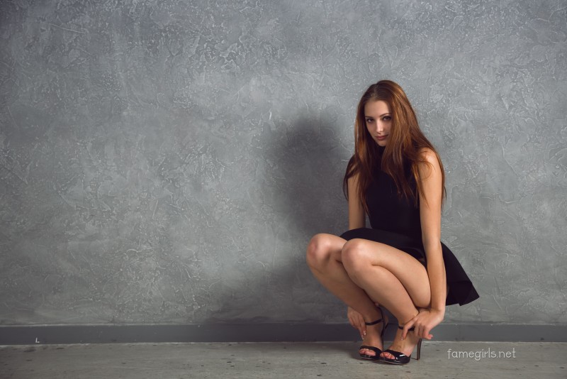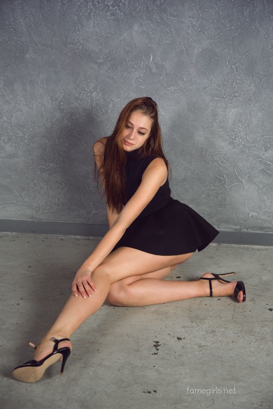 Скинув с себя босоножки, элегантная стройняшка с худенькой талией эротично позирует в короткой юбке и присаживаясь на пол засвечивает бритую письку, для этого раздвигая промежность и поджимая коленки. Наслаждаясь, сексуальная девушка так же немного приподымает топик и показывает маленькие сиськи.