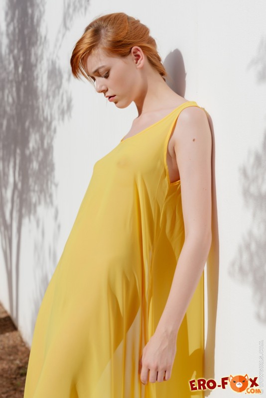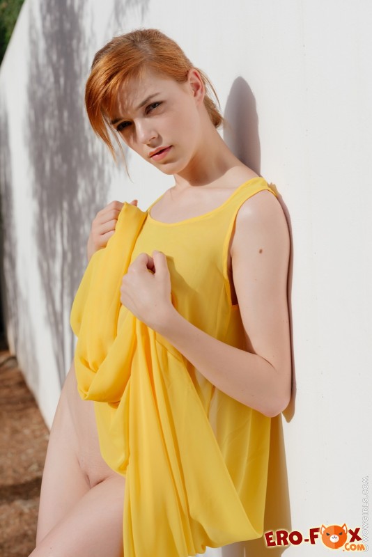 Стоя на улице у стены, красивая рыжеволосая девушка начала эротично стягивать платье и показывать сексуальное тело, страстно посматривая в снимающую происходящее камеру. Первым делом красотка засвечивает упруги сиськи с привлекательными сосками, а после животик с бритой писькой, в процессе чередуя позиции и трогая себя руками.