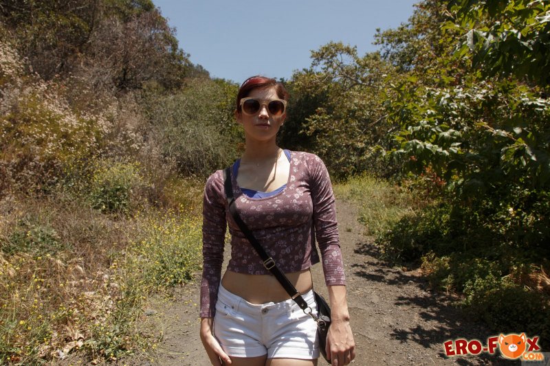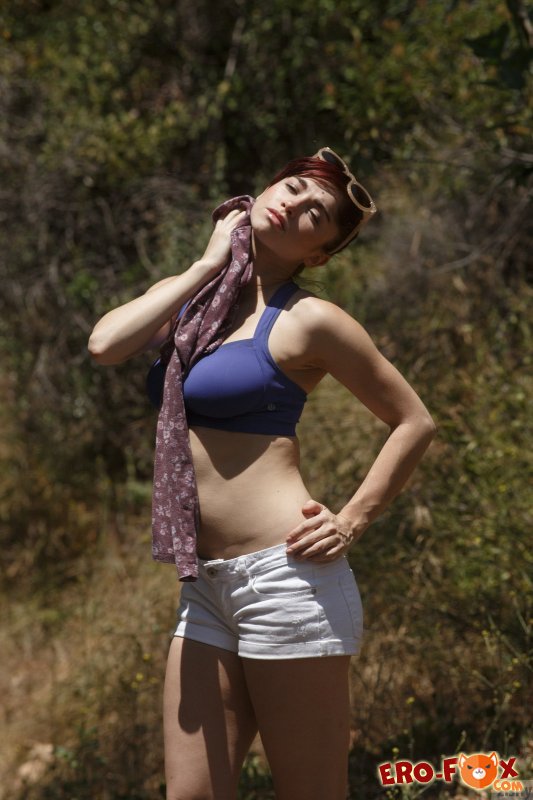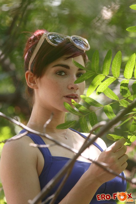 Соблазнительная рыжая девушка прогуливалась по парку и решила немного позабавиться и показала свои большие сиськи на камеру. А началось всё с того что она вручила фотокамеру своей подруге, вместе они нашли местечко поукромнее и там наша героиня сняла шортики оставшись в милых трусиках через которые видно её упругие ягодицы. Немного погодя девушка стянула топик под которым скрывались большие упругие сиськи как мячики, коими девушка нас и наградила с экранов мониторов.