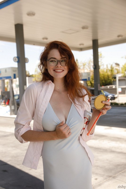 Прогуливаясь на улице и попивая колу, грудастая рыжая студентка в очках в какай-то момент устраивается на газоне и задирает юбку платья, демонстрируя нам трусики. А желая посильнее привлечь наше внимание, сексуальная девушка натягивала одежду и подчеркивала натуральные крупные сиськи на которых торчали соски.