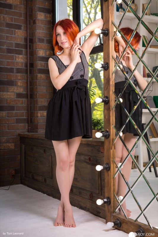 Строя глазки и эротично позируя перед фотографом с камерой, рыжая девка возбуждается и в дальнейшем снимает короткое платье, обнажая перед нами смачную упругую жопу. Оставшись в чём мать родила, огненная красавица с маленькими сиськами поглаживает сосочки, а так же демонстрирует волосатый лобок с бритыми половыми губками.