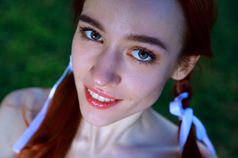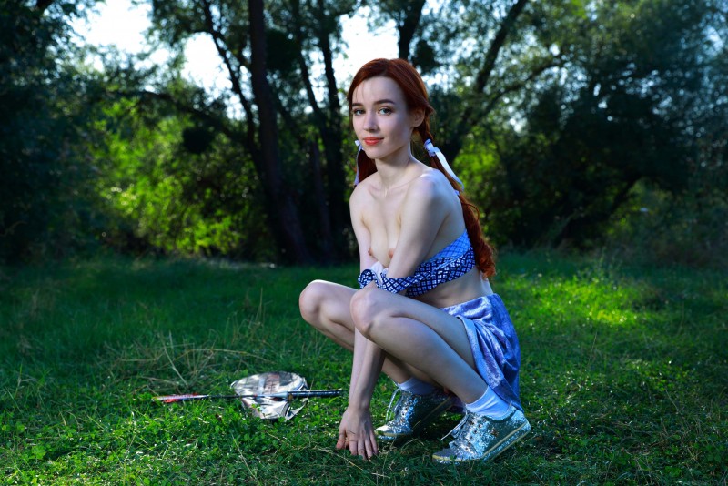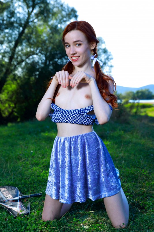 Вдали от домов в тени деревьев деревенская девка игриво обнажается перед камерой и развратно стоит раком в траве на природе. Худая рыжая девица с маленькими титьками совершенно без комплексов и не стесняется своего тощего бледного тела, когда крупным планом показывает свою бритую пухлую письку.