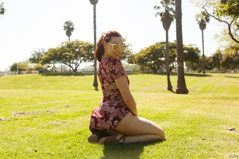Бесстыжая рыжая баба, захватив с собой безотказного фотографа, разделась на улице и игриво позирует на камеру. Развратная телка в коротком платье расположилась в общественном парке и показывает всем свои маленькие сиськи с острыми возбужденными сосками и аппетитную задницу в трусиках под юбкой.