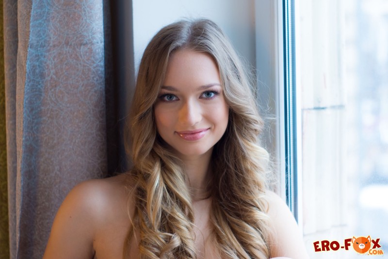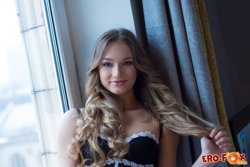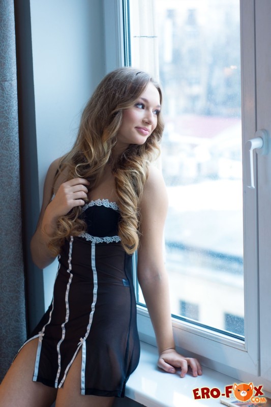 Присаживаясь на подоконник, молоденькая сексуальная красотка в эротичном пеньюаре начинает медленно раздеваться у окна, стараясь в процессе мило улыбаться и трогать вьющиеся локоны руками. Как только на девушке не осталось ничего лишнего, та засветила маленькую грудь с плоским животиком и бритую письку с гладеньким лобком.