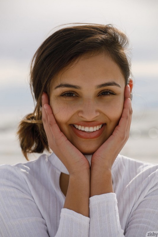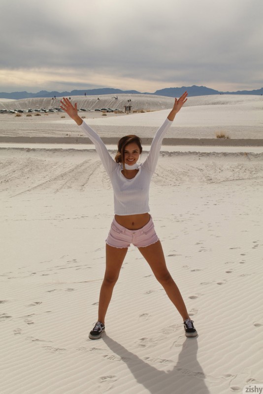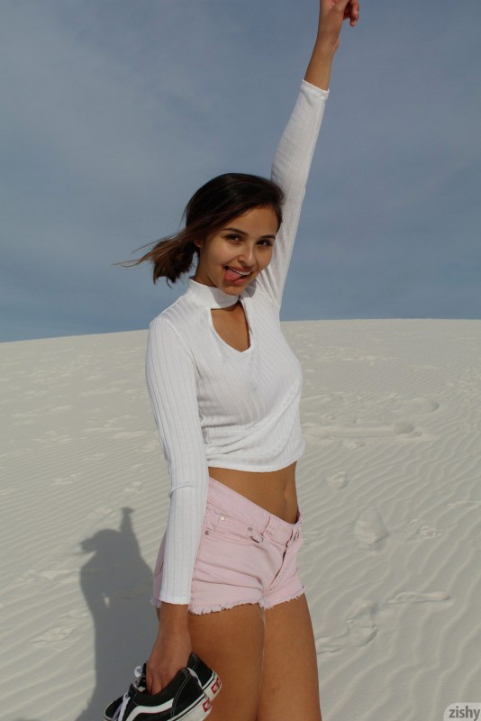 Нарядившись в короткие розовые шорты и белую кофточку, обаятельная и весьма сексуальная девушка с красивыми бедрами кривляется в небольшой пустыне и мило улыбается своему спутнику с фотоаппаратом. Желая поднять накал страстей, смуглая девка немного отодвинула одежду и показала упругие красивые сиськи с торчащими от возбуждения сосками.